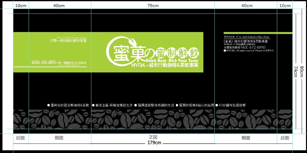 面板尺寸為:179x80cm  其中面板的設(shè)計(jì)安排為(10+40+79+40+10)x80cm (上下3cm不要有文字,會(huì)被包住的)